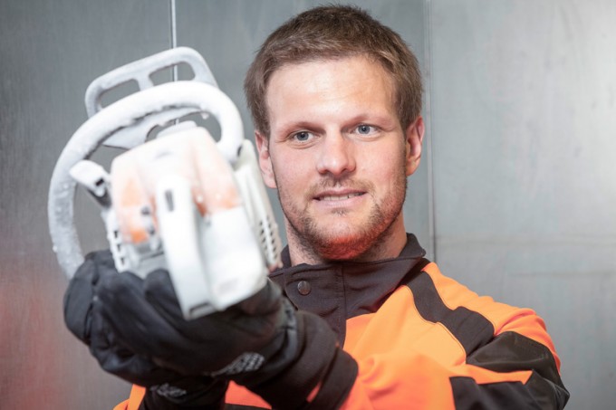 Физические испытания команды исследования материалов помогают найти правильные материалы для каждой из запчастей. Для STIHL MS 150, самым важным критерием для запчастей стало одно: они должны быть легкими.