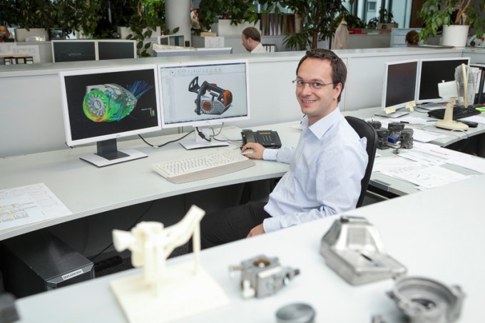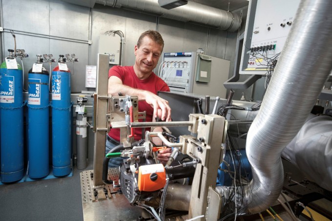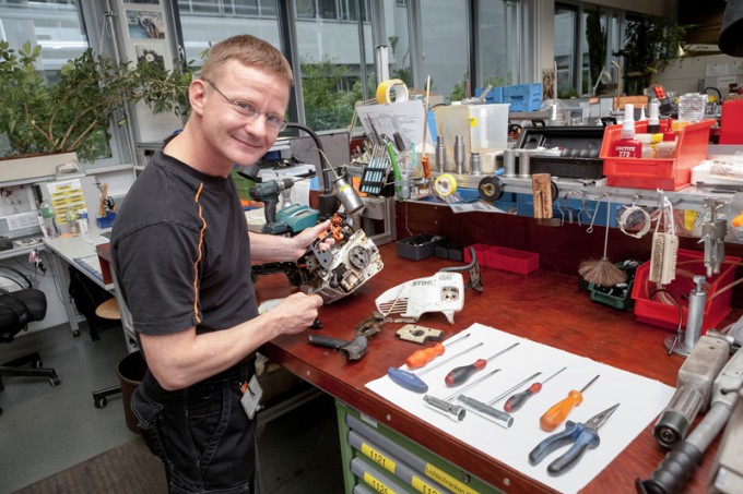 Сотрудники компании Stihl разрабатывают компьютерную модель - прототип будущего агрегата. Среди прочего, они имитируют мощность двигателя и охлаждение. Благодаря этому теоретическому испытанию, сокращается количество циклов испытаний с использованием образцов.