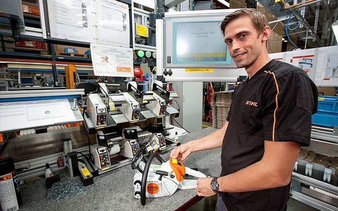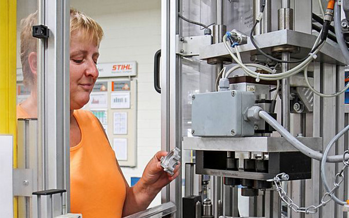 Каждая машина проходит испытания в настроечной в кабине перед тем, как покинуть сборочный конвеер. Это специальное оборудование можно найти только на заводе STIHL, оно помогает достичь идеальной настройки карбюраторов. Кроме того, проводятся тесты всех функций безопасности, таких как тормоз цепи.
