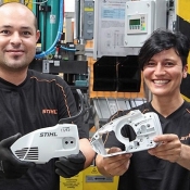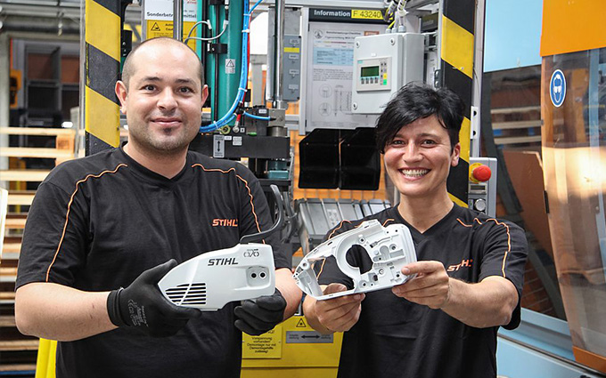 Преимущество деталей из полимерных материалов перед магниевыми заключается в том, что они, будучи многофункциональными, могут использоваться без дополнительной обработки и выполняют в инструменте функции, для которых прочность магния не требуется. В STIHL при производстве деталей из полимерных материалов, помимо традиционной технологии литья под давлением с одно- и многократной формовкой, используются также такие технологии, как литье с газом или двухкомпонентное литье. После этого отлитые детали проходят дополнительную обработку с использованием других технологий, например, тампонной печати или виброконтактной сварки, а затем собираются в готовые к монтажу узлы.